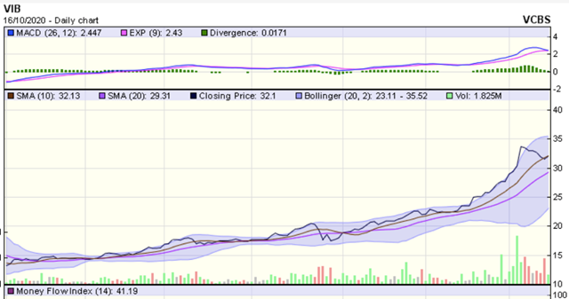 Về diễn biến giá, tương tự có thể thấy đà đi lên mạnh ba tháng qua tại HDB, VIB…